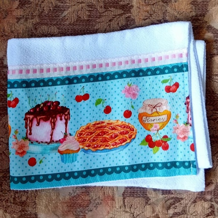Pano de prato com passa fita e estampa decorada com barrado digital