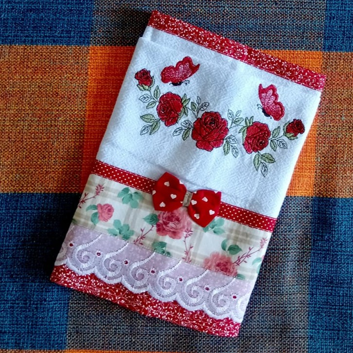 .Pano de prato com passa fita, tira bordada e estampa decorada com bordado a máquina