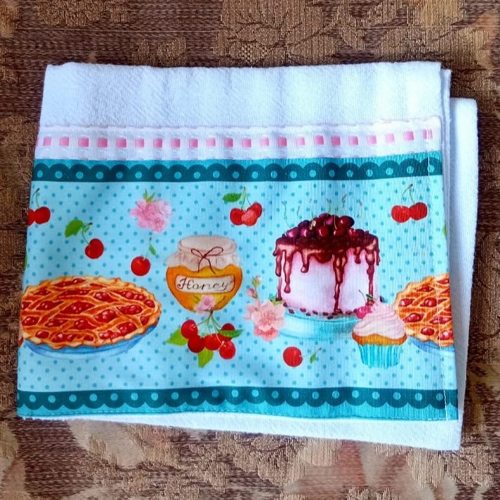 Pano de prato com passa fita e estampa decorada com barrado digital