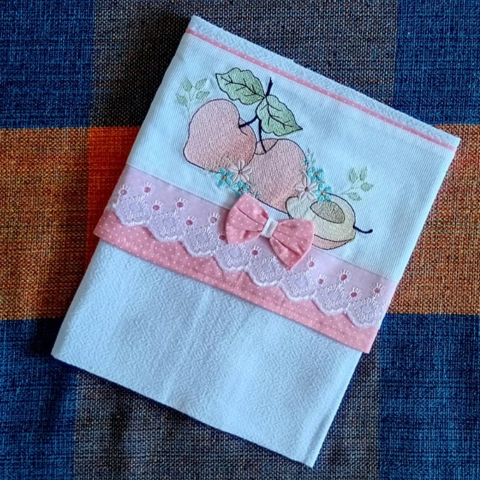 .Pano de prato com passa fita, tira bordada e estampa decorada com bordado a máquina