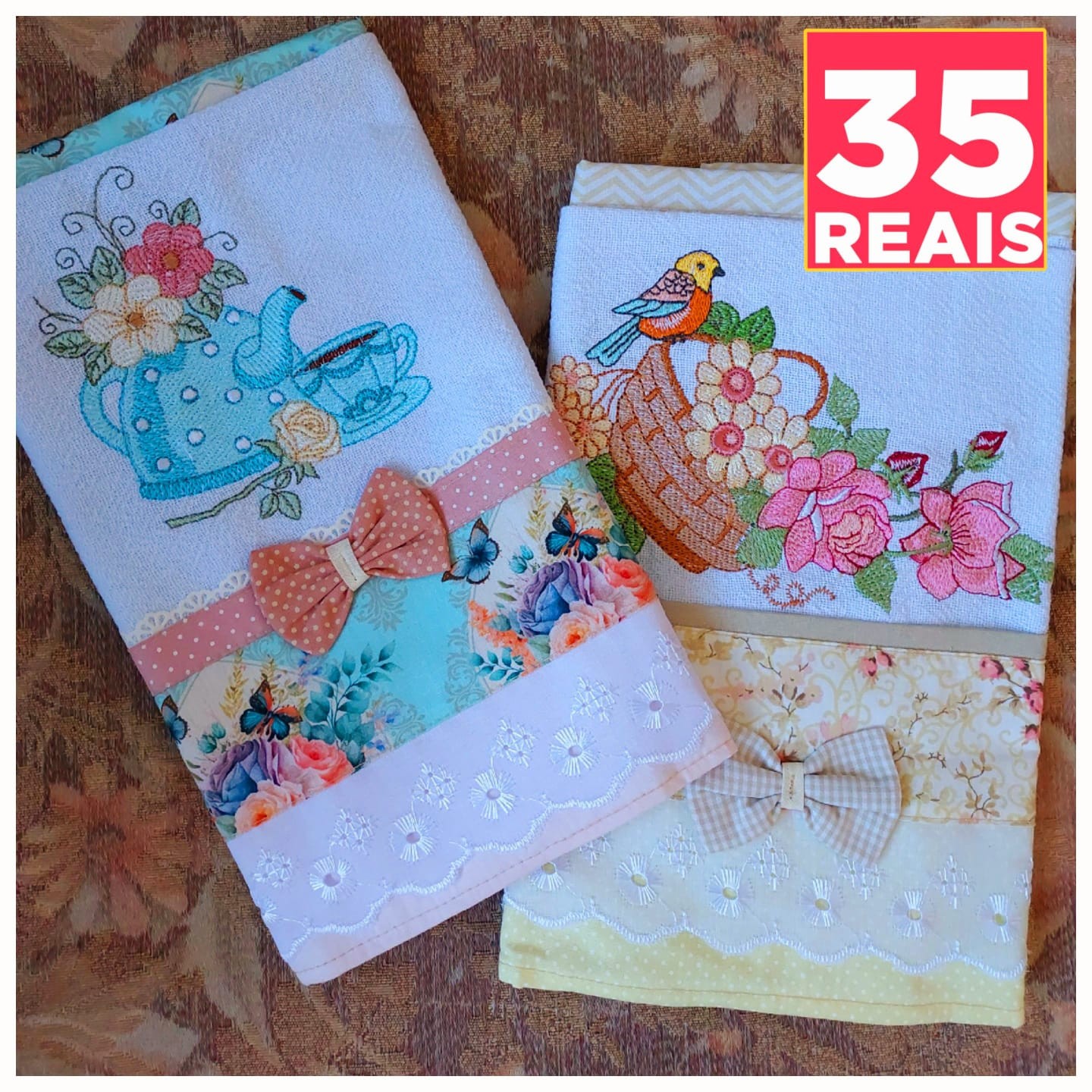 Pano de prato com passa fita, tira bordada e estampa decorada com bordado a máquina