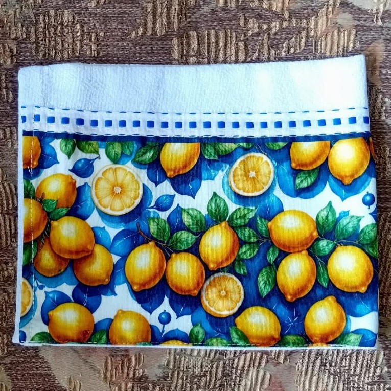 Pano de prato com passa fita e estampa decorada com barrado digital