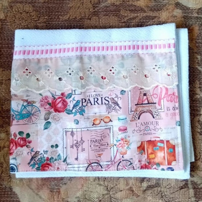 Pano de prato com passa fita e estampa decorada com barrado digital