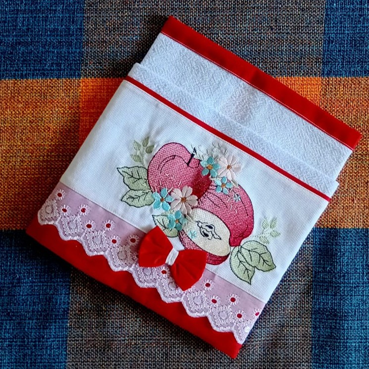 .Pano de prato com passa fita, tira bordada e estampa decorada com bordado a máquina