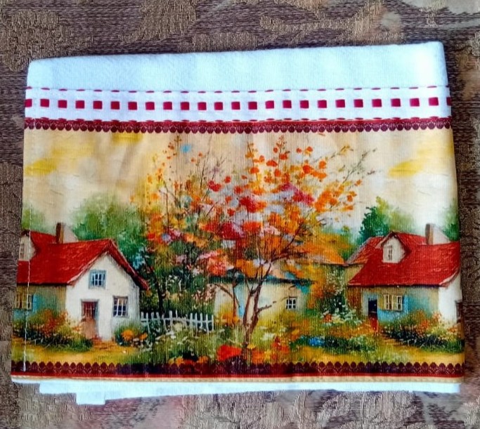 Pano de prato com passa fita e estampa decorada com barrado digital